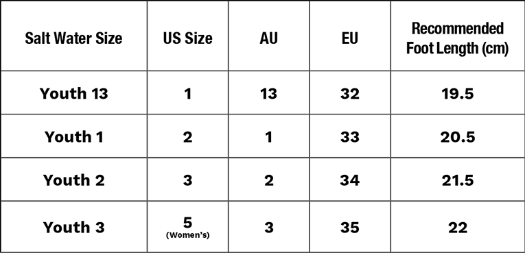 Salt Water kids sandals generally run one size larger than standard US sizing (unlike the Sun-San Styles). In practice this means a child who wears a US size 9 would usually choose a Salt Water 8. The Salt Water size is stamped on the bottom of the sandal and is also shown in each product’s size dropdown menu.