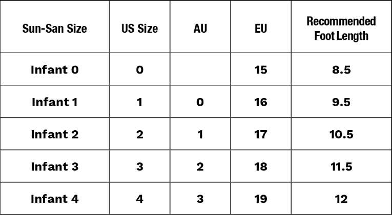 - Sailor: Infant 2 – Youth 3 — with straps that enclose the foot; this style fits slightly narrower and shorter than others.