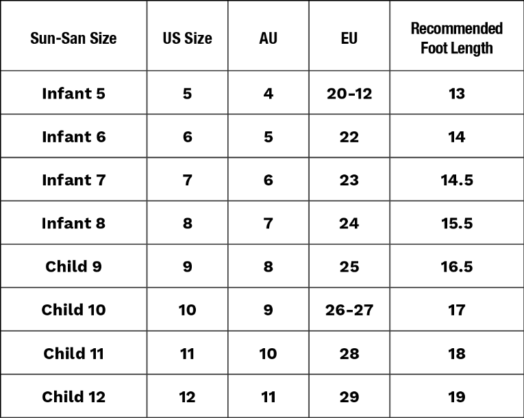 Sun-San kids sandals use standard US sizes and this is the size is stamped on the bottom of the sandal.