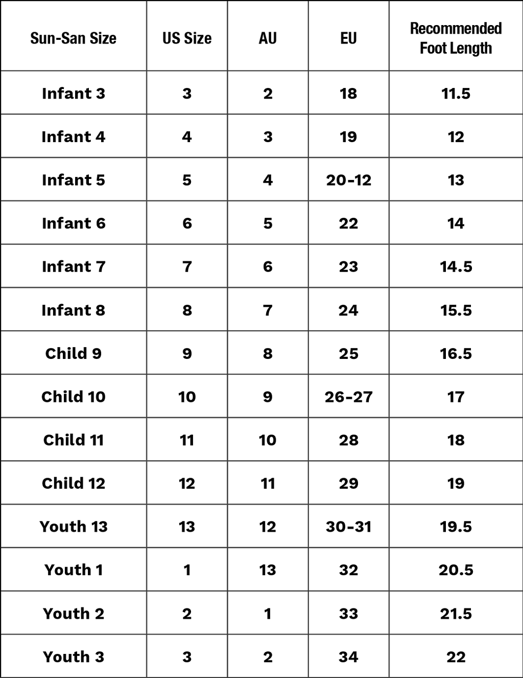 - Sailor: Infant 2 – Youth 3 — with straps that enclose the foot; this style fits slightly narrower and shorter than others.
