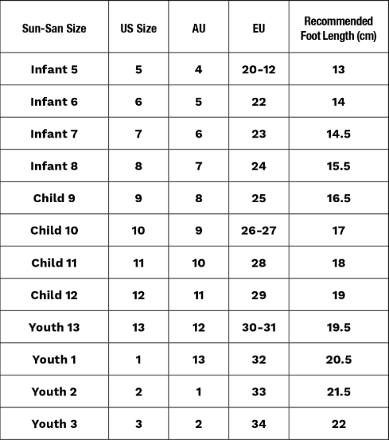 Sun-San kids sandals use standard US sizes and this is the size is stamped on the bottom of the sandal.