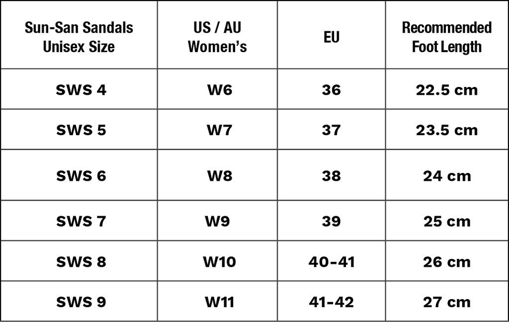 Salt Water Sandals have their own unique sizing system — so before you dive in, check the Size Guide below or visit our full Sizing + Care page.