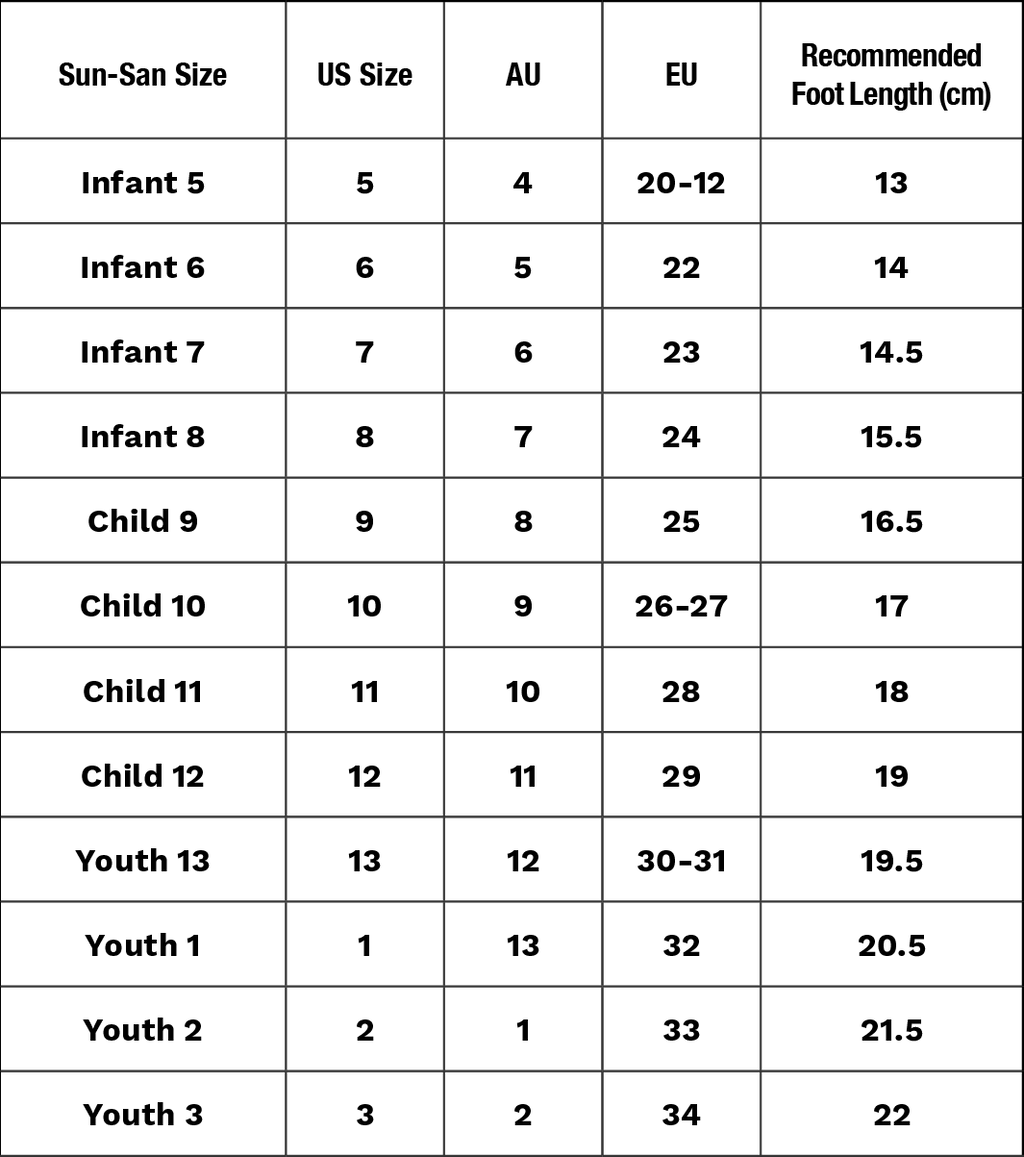 Sun-San kids sandals use standard US sizes and this is the size is stamped on the bottom of the sandal.